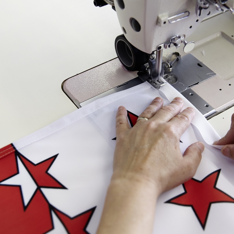 Wir drucken mit hochreinen Polyester-Textilfarbstoffen. Damit diese wetterfest, waschbar und absolut scheuerbeständig werden, fixieren wir alle Drucke unter Hitze.